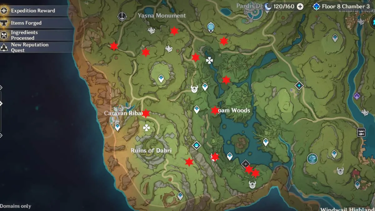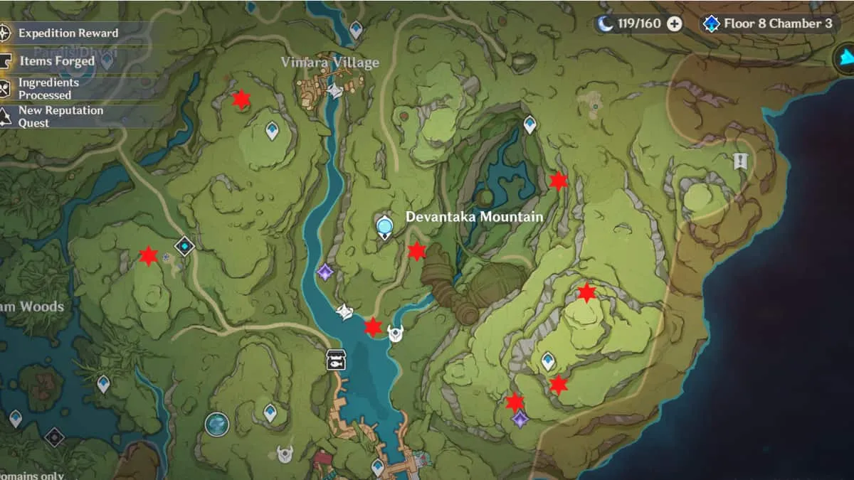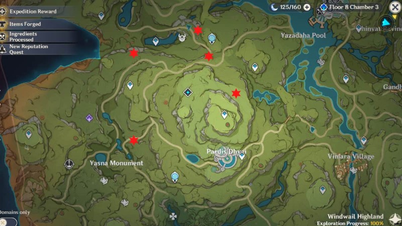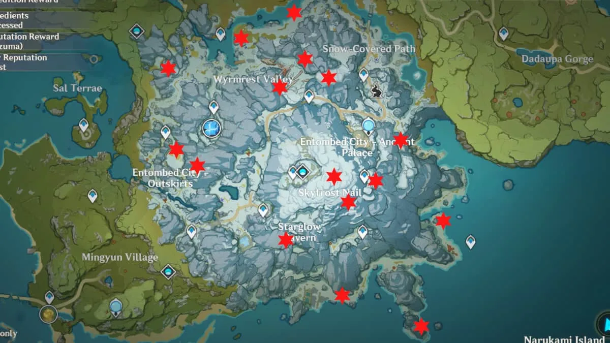 現在、Dragonspine のタイム トライアルを完了するための実績はありませんが、これらのチャレンジでは、Crimson Agate、チェストの発見、Dragonspine 地域の新しいエリアのロック解除など、他の報酬を提供できます (In The Mountains クエストラインをクリアするために必要です)。 16 のタイム トライアル ロケーションすべて Dragonspine の場所は、下の地図にマークされています。