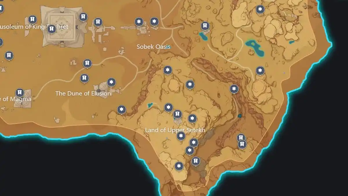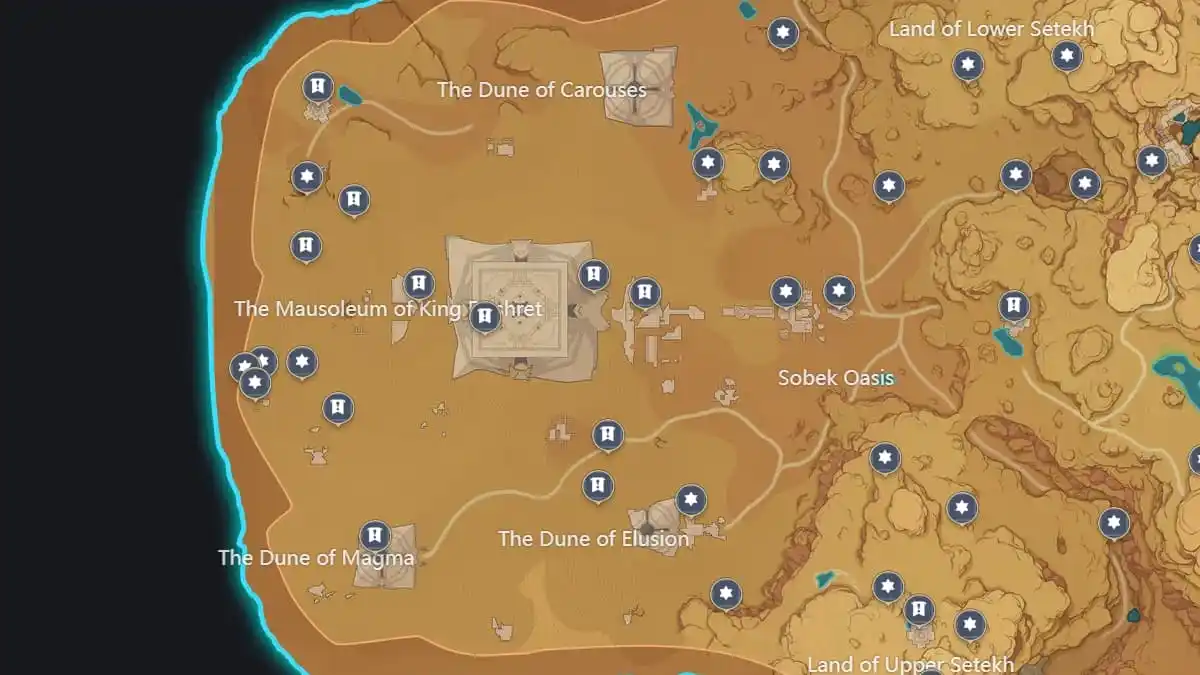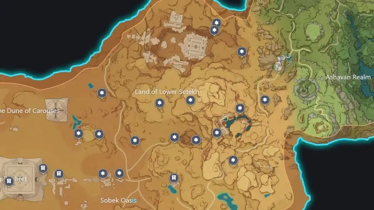 Sumeru's Desert has 52 time trial challenges between three main areas:The Hypostyle Desert, Land of Lower Setekh, and Land of Upper Setekh. Time trial challenges on the desert surface are marked with a star. Some time trials are below ground or inside a tomb or cave, and you will likely need to have completed the Golden Slumber World Quest to be able to access them. These challenges are marked with a banner and an exclamation point. Completing 10/20/40 challenges will unlock the Quicksand Adventurer Achievement.