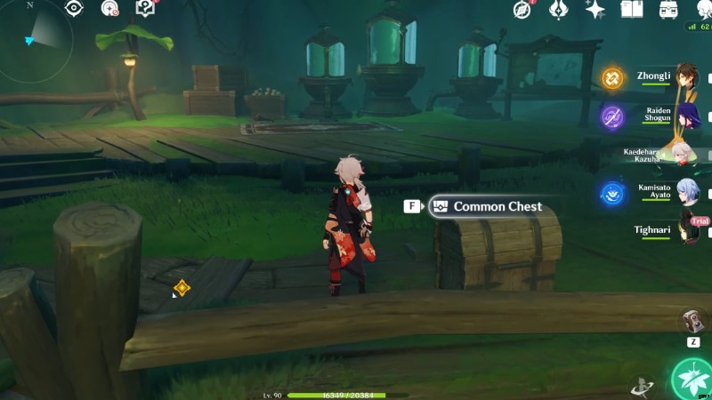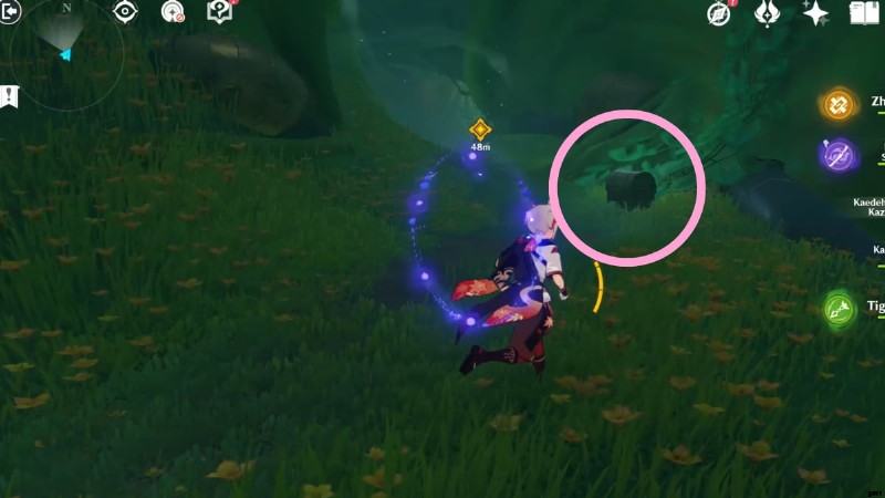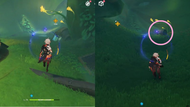 コモンチェストの横には、Cultivation の Clusterleaf があります。 デンドロを適用 四つ葉の印章を召喚するために植物に行きます。ティグナリがトライアル キャラクターとしてチームに参加するので、デンドロ キャラクターを持っていなくても心配はいりません。 .四つ葉の紋章を使って上向きに進み、地面の茶色い斑点に向かって滑空します。地面が割れて落下しますので、落下ダメージに注意してください。