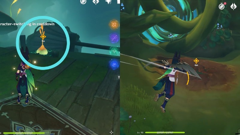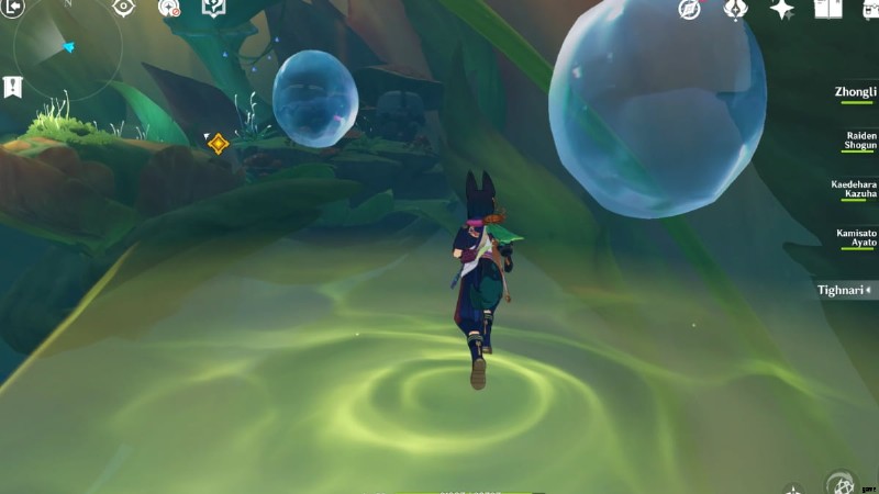 見えない橋が敷いた道をたどってください クエストマーカーをガイドとして使用して、正しい方向に進んでいることを確認してください.何度でも挑戦できるので、転んでも安心。パスの終わりに向かって泡を避けてください!最後のプラットフォームに着いたら、四つ葉のシジルを使って高所に向かい、慎重に急降下します ルイン センティネルを倒す Tighnari との小さなカットシーンを促します。