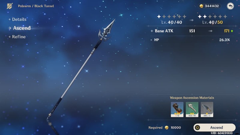 Black Tassel は HP Substat で有名です。これは、Zhongli、Thoma、Candace など、最大 HP に合わせてスケーリングするキャラクターに最適な予算オプションです。残念ながら、その武器スキルはほとんど無駄です。スライムの敵にのみ適用されるため、この武器はユーザーのサポート能力を高めますが、一般的にDPSが失われます.黒のタッセルは、ウィッシュ バナーから簡単に入手できます。その武器スキルからはあまり利益を得られないため、簡単に最大の洗練度に達することができますが、通常、このポールアームをうまく機能させるためにそれを行う必要さえありません.