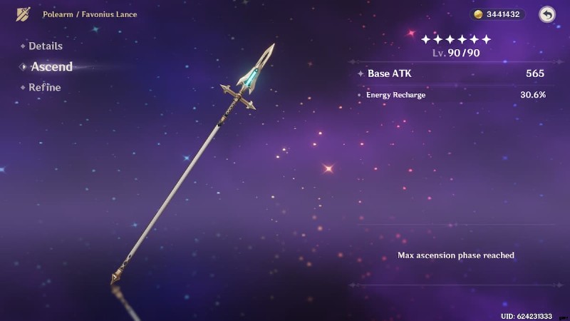 ダメージを与える武器ではありませんが、ファボニウス ランス トーマ、ユンジン、キャンディスなどのポールアームキャラクターをサポートするのに最適な武器です。 Energy Recharge サブスタットは、Elemental Burst によってパーティのダメージをブーストするキャラクターに特に役立ちます。その武器スキルには、クリティカル ヒットでさらに多くのエレメンタル パーティクルを提供するチャンスもあります。