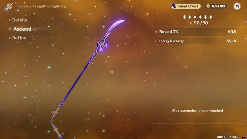雷電将軍のシグネチャーウェポン、エンガルフィング ライトニング 、彼女とシャンリンにとって強力な武器です。これは「The Catch」と非常によく似ており、Energy Recharge サブスタットを共有しています。この 5 つ星の武器を際立たせているのは、その武器スキルである タイムレス ドリーム:エターナル ストーブ です。 .装備しているキャラクターの追加のエネルギー再充電のすべてを追加の攻撃に変換します。精錬ランク 1 では最大 80%、精錬ランク 5 ではなんと 120% の攻撃になります。