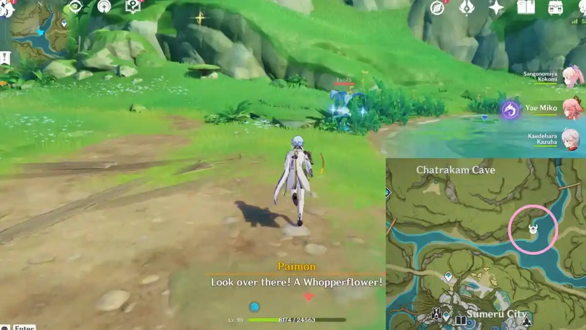 上の画像の丸で囲まれたエリアに向かうと、Cryo Whopperflower を見つけることができます。このコミッションを初めて行う場合、ホッパーフラワーを倒すと、Up by the Roots と呼ばれる世界の驚異の実績を獲得できます。 .