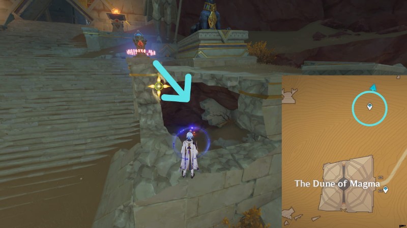 テレポート ウェイポイントに向かいます マグマ砂丘の北に行き、割れ目に入る 階段前。中に入ったら、たき火の後ろの入り口から洞窟に入り、地面の穴が見えたらすぐに滑り降ります。