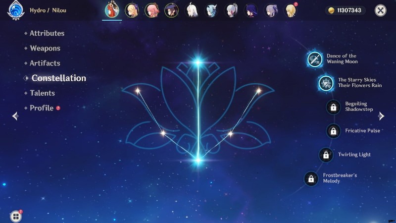 - 星空、花雨 - エレメンタル レジスタンスを減少させるコンステレーションがある場合は、自動的にそれが非常に強力であると想定します。この星座は、Nilou 自身がより多くのダメージを与えることができるだけでなく、Hydro と Dendro のチームメイトにも影響を与えます。これは、使用に関係なく、Nilou の最適なチーム構成とビルドに対する大幅なダメージブーストです。非常識な価値。
