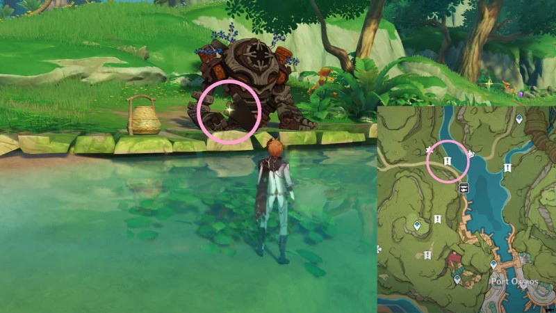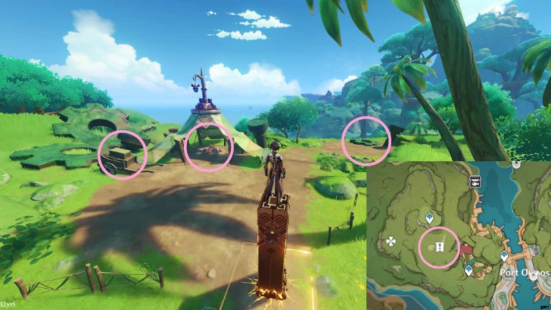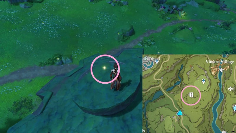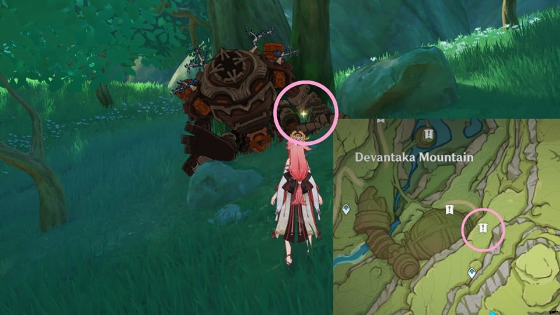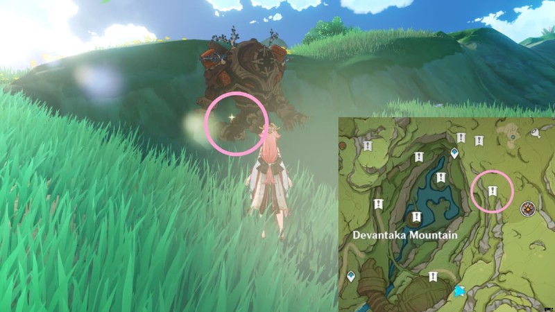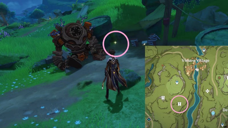 Head to the area circled in the image above to find a sparkling spot on a giant nail, which is situated near some Hilichurls. Interact with it to obtain a Lost Energy Block.