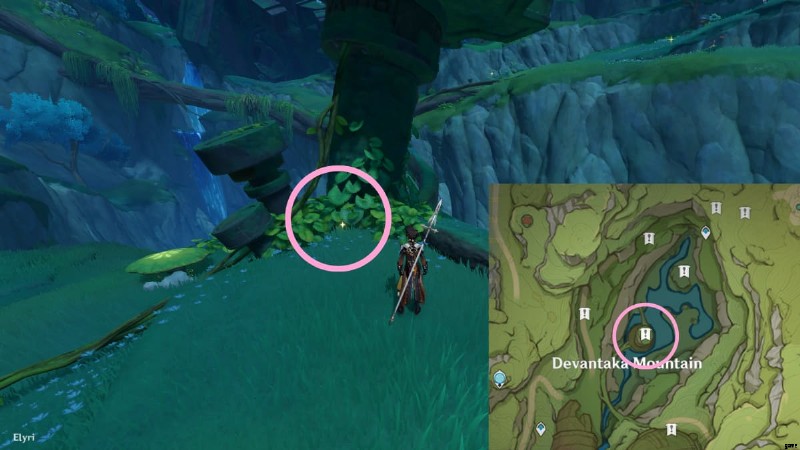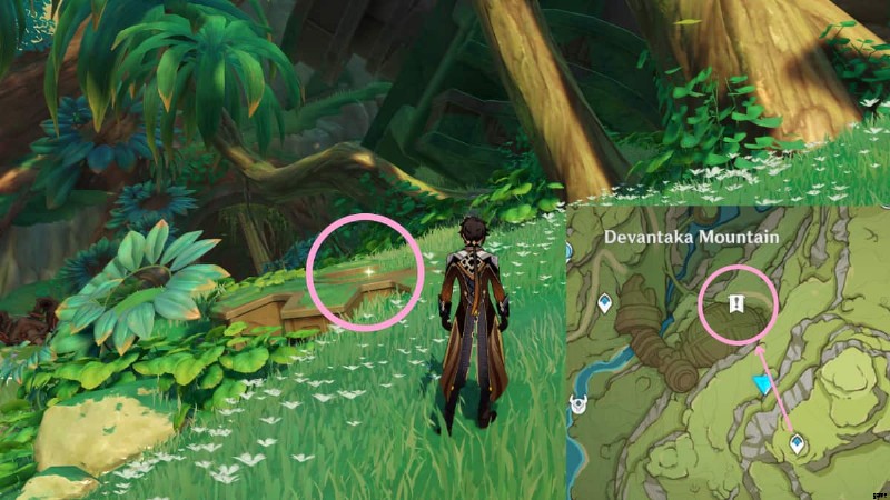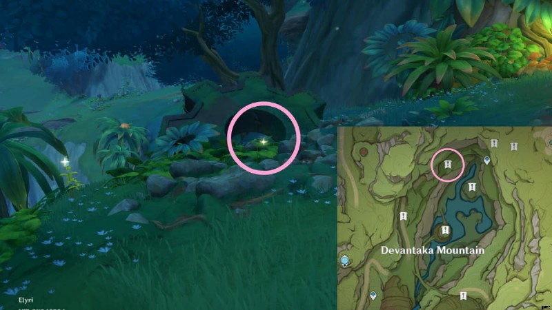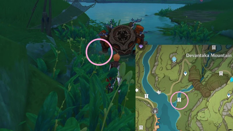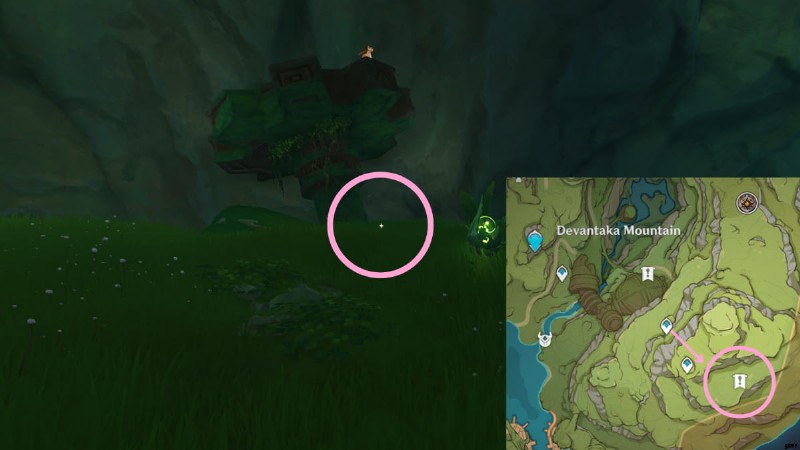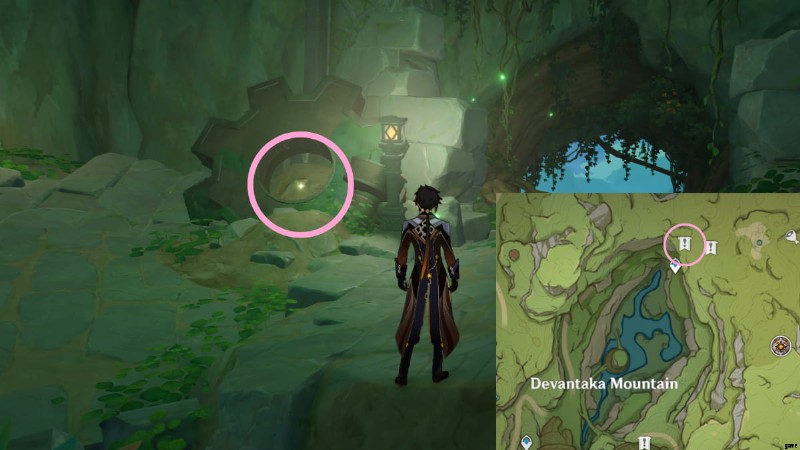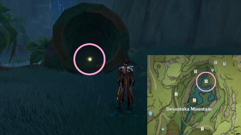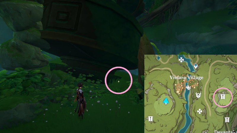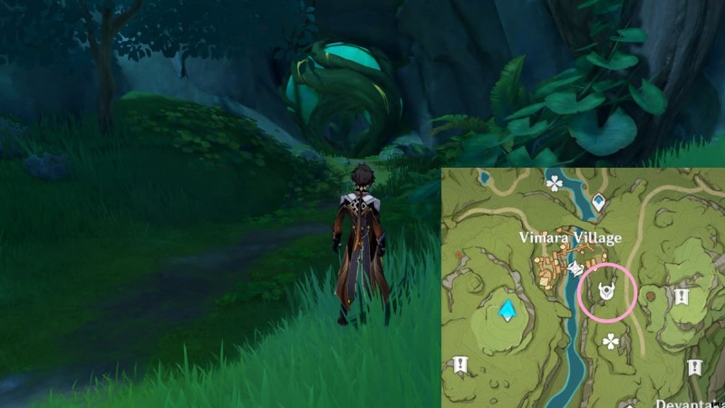 次のロスト エナジー ブロックを見つけるには、ヴィマラ村の地下洞窟に向かう必要があります。行き方がわからない場合は、上の画像の丸で囲まれたエリアに行き、Vamadhaに入って地下の洞窟を見つけてください.