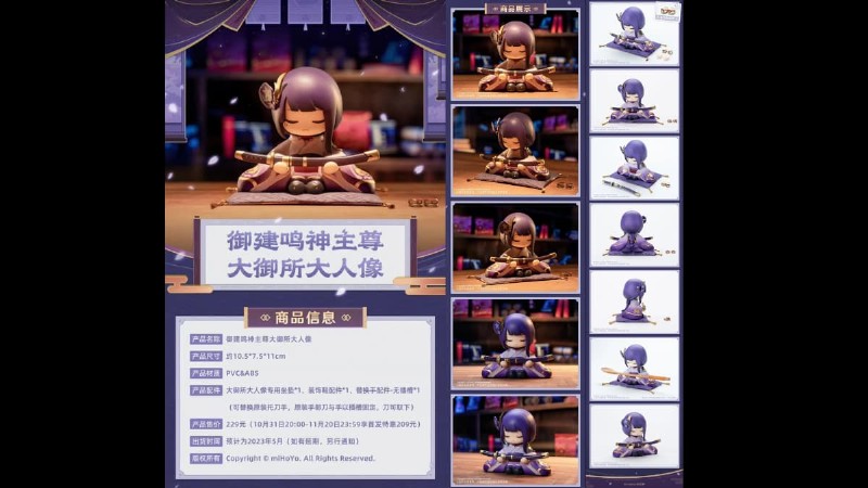 先行予約 2022 年 10 月 31 日午後 8 時 (UTC+8) に、原神インパクト Tmall で全能の鳴神大御所、雷神閣下の像が始まります。価格は 229 人民元 (約 32 米ドル) ですが、2022 年 10 月 31 日から 2022 年 11 月 20 日の間に予約注文すると、209 人民元 (約 29 米ドル) の割引価格で購入できます。日付は 2023 年 5 月です 、生産の遅延がないことを前提としています。