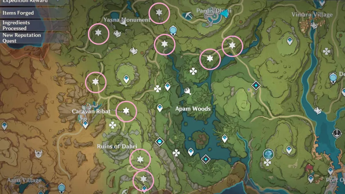 Sumeru の熱帯雨林の周りには 9 つの宝箱が隠されています。巣穴の下にあるので、まず掘る必要があります 精巧なチェストを生成し、それを略奪して、隠された探索目標を進めます。それらの場所はすべて下の画像で丸で囲まれていますが、すべて地上にあることに注意してください。 .すべてのチェストの場所の詳細な内訳については、読み続けてください。