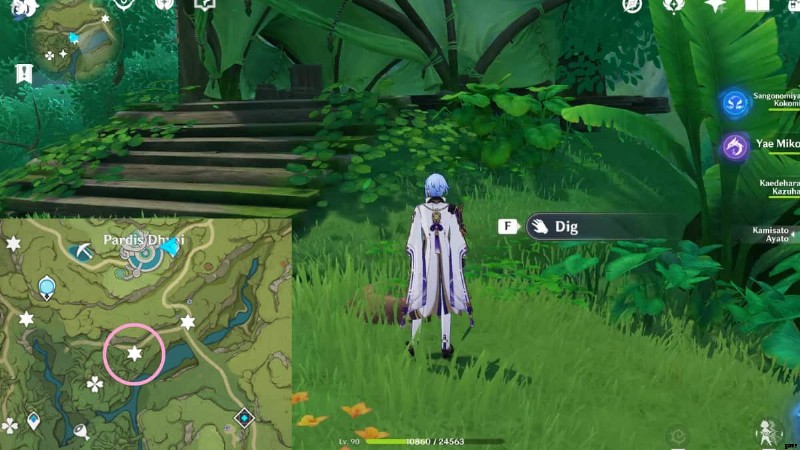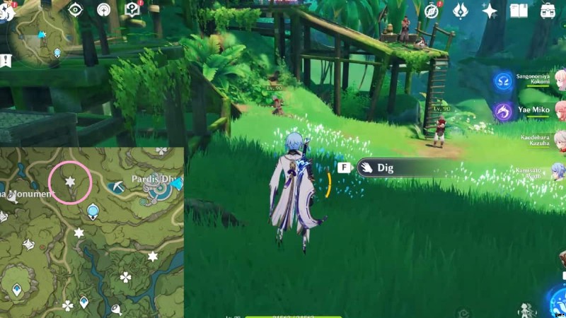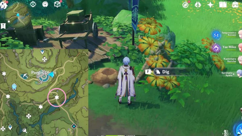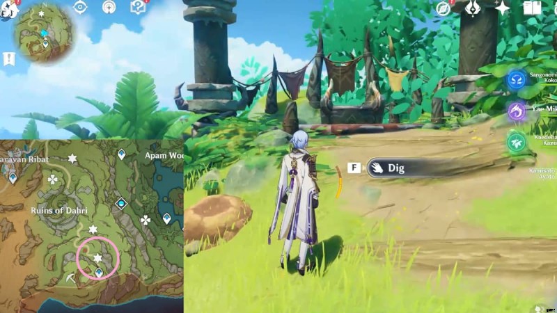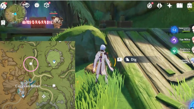 上の画像で丸で囲まれたエリアに向かい、いくつかの植物の横に土の巣穴を見つけます。 掘るためにそれと対話してください 、絶妙なチェストを明らかにします。 略奪する必要があります パイモンからの小さな会話を取得し、目的を達成するための宝箱。