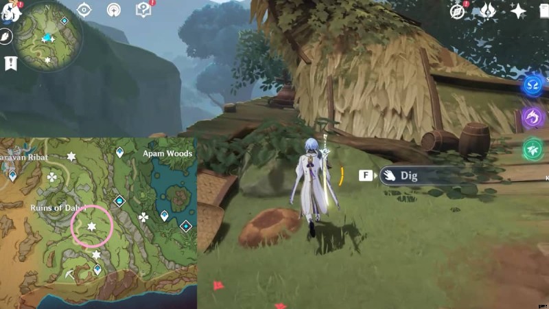 上の画像の丸で囲まれたエリアに向かうと、ヒリチュルの休憩エリアの横に土の巣穴があります。 掘るためにそれと対話してください 、絶妙なチェストを明らかにします。 略奪する必要があります パイモンから小さな会話を受け取り、目的を達成するための宝箱。