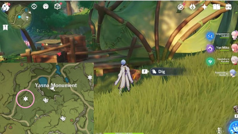 上の画像で丸で囲まれたエリアに向かい、木製の階段の横にある土の巣穴を見つけます。 掘るためにそれと対話してください 、絶妙なチェストを明らかにします。 略奪する必要があります パイモンからの小さな会話を取得し、目的を達成するための宝箱。