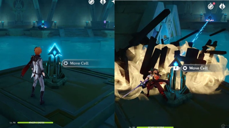そうは言っても、目的はかなり単純です。各デバイスを操作してセルを 2 回移動 任意の順序で、ハイドロ モニュメントに面しているようにします。左側で、セルを移動してハイドロ モニュメントに接続した後、必ず木箱を壊してください。 プライマルビームを通過させます。右側では、セルを移動して他のハイドロ モニュメントと接続するだけです。