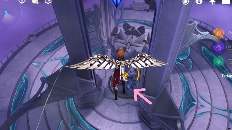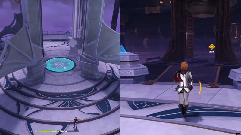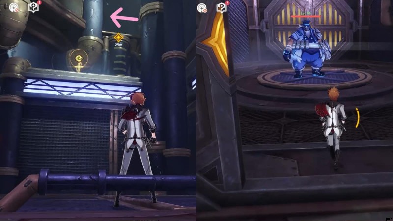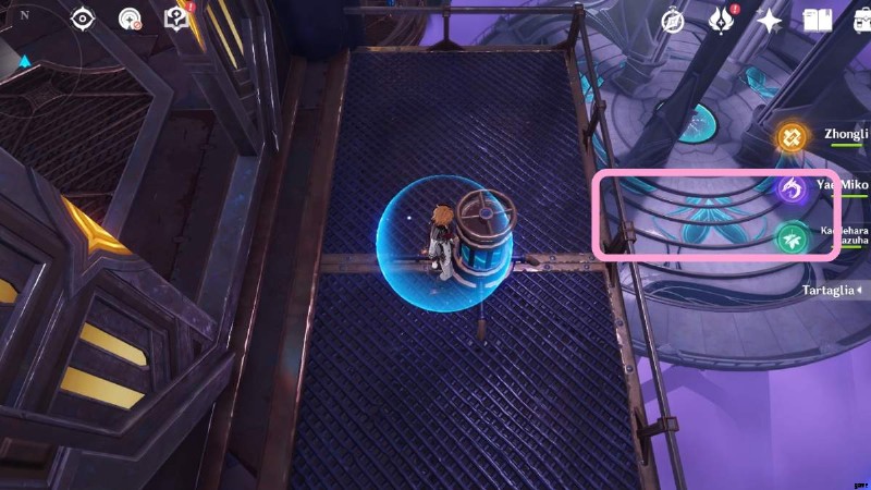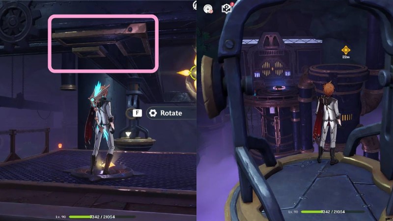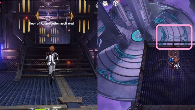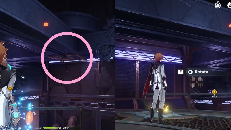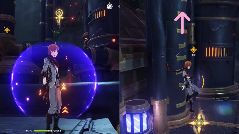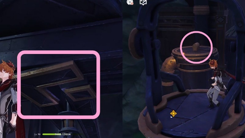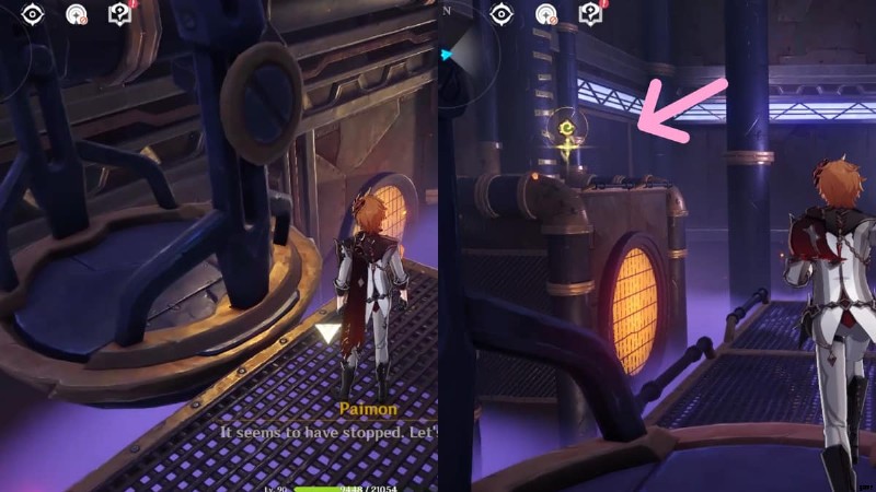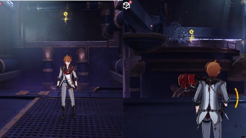 それが終わったら、後ろを振り返って 左折 そして見て アップ 四つ葉の印章を見つける。 Four-Leaf Sigil に引っ掛けて上に進み、同じプラットフォームでパイプを登ります。起き上がると、ドアが開き、Cryo Fatui Skirmisher が現れます。彼を倒して絶妙な宝箱を明らかにする そして隣の部屋の扉を開ける。チェストを略奪した後、部屋に入って別のデバイスを見つけます。