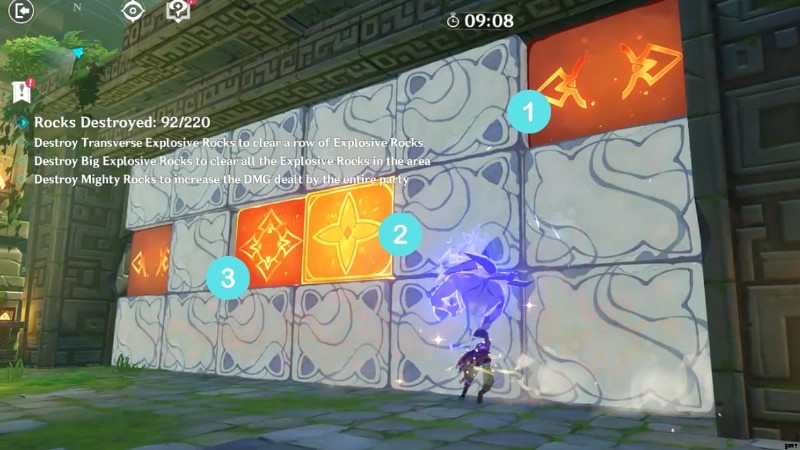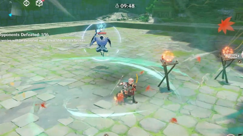 カズハは、彼の広範囲のスワール攻撃がシールドを壊すのに素晴らしいことを知っています.したがって、このチャレンジでは、16 人のアビス メイジのシールドを破壊するために、環境からエレメンタル ソースを渦巻く必要があります。 パイロトーチの近くに行く そしてハイドロロック 、その後、カズハのエレメンタル スキルとバーストをトリガーして目的を完了します。