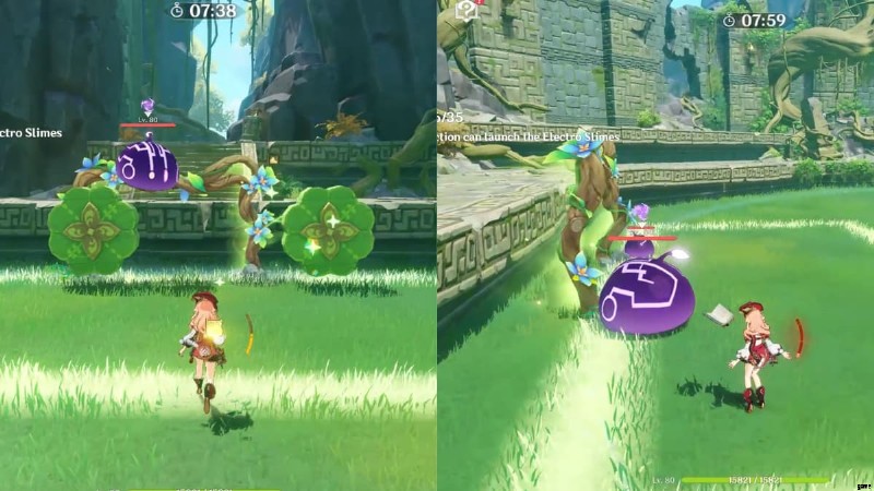 クレーとヤンフェイの通常攻撃を使ってそうすることができます 、チャージ攻撃 、およびエレメンタル スキル .オーバーロードをトリガーすると、敵がノックバックし、スライムをつるゴールに押し込むことができます。チャレンジは、35 ゴールを獲得することで完了します。