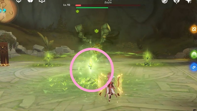 ただし、クレンジング プロセスをスピードアップするために、修復髄を活性化状態にしてパワーアップすることができます。 .これは、Dendro を適用することで実現できます 、その後すぐに Electro をフォローアップ .活性化された状態の修復髄は、通常よりもはるかに明るく見えます — 上の画像の円で囲まれた結晶を参照してください.
