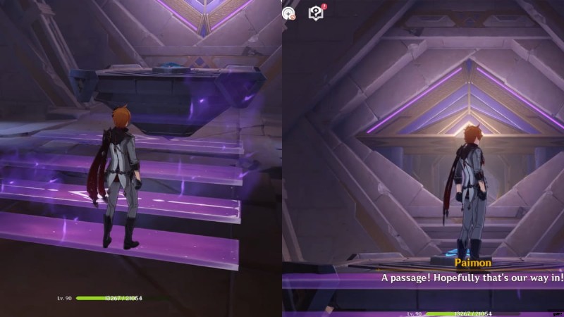 浮遊プラットフォームに近づくと、プラットフォームのメカニズムに到達するのに役立つ目に見えない階段が出現します。 メカニズムを 1 回操作する 目の形の通路を前方に回転させます。通路を通って進みます。