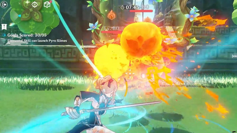 パイロスライムがつるの目標に近すぎる場合、ジーンには範囲が必要なため、最初のチャレンジのようにそれらを押すことはできません。 スライムをゴールに正しく投げ入れる。そのため、ゴールから少し離れたところに立ち、スライムを手前に引き寄せてからエレメンタル スキルで投げ込みましょう。