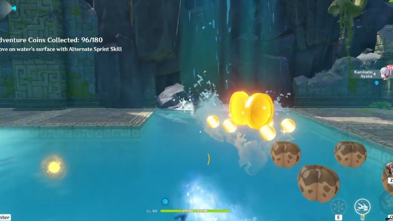 このチャレンジでは、Ayaka の Alternate Sprint を使用する必要があります。これにより、Ayaka は地面または水中に姿を消し、移動中に Cryo を継続的に適用できます。 長押しするだけ スプリント ボタンを押し、方向キーを使用して絢香を動かし、180 アドベンチャー コインを集めて目的を達成します。水に浮かぶ黄色いエネルギー ボールに近づくと、スタミナを回復できます。 .視界を遮る可能性があるため、泥のボールを避けるようにしてください。ただし、スプリントを中断することはありません。