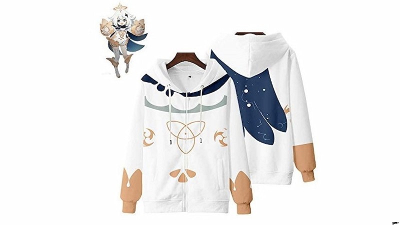 このパーカーは、パイモンをイメージした前後のデザインで、銀色がかった色と青いマントが特徴です。柔らかく肌に優しいポリエステル製で、6 種類のサイズが用意されているので、友人や家族にぴったりのものがきっと見つかります。