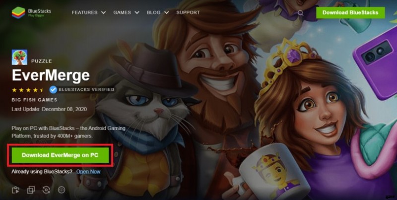 このダウンロード ページに移動し、[EverMerge を PC にダウンロード] をクリックします。 " ボタン。これにより、BlueStacks エミュレータをダウンロードしてから、ゲームをダウンロードできます。