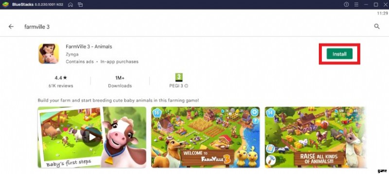 BlueStacks が FarmVille 3 をプレイする機会を提供しない場合 Play ストアからダウンロードする必要があります。これは、エミュレーターのホームページに既にあるはずです。それをダブルクリックして、FarmVille 3 を検索します。次に、[Install] をクリックします。 " ボタンをクリックすると、エミュレーターがゲームを取得し、ホーム画面に表示します。