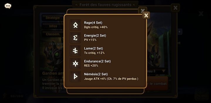 - Nemesis rune (2 sets ):increases the attack gauge by 4% each time you lose 7% of your HP;