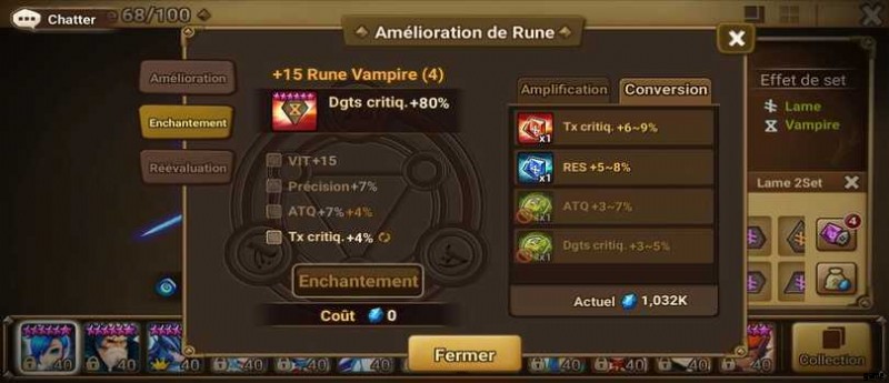 Enchantments allow you to improve a sub-property of a rune. It is possible to amplify the sub-property with a grindstone or to replace it with a gem by another sub-property as shown here.
