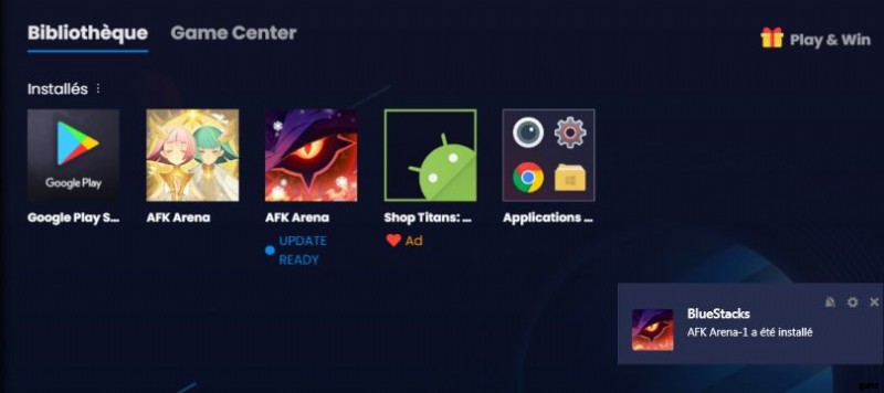 BlueStacks がサーバー テストをインストールするのに少し時間がかかります。インストールすると、通知 それを確認すると、ゲームのリストにある「新しい」AFK アリーナにアクセスできます (ウェブサイトと同じ赤い目で)。