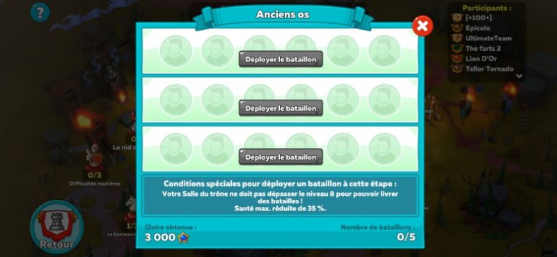 クラン メンバーはそれぞれ、マップ上の場所ごとに 1 つの分隊を配置できます . 妊娠していない限り、チームに属していないメンバーを追加することもできます (最大 6 人まで)。 .これにより、トレーニングやリソースの収集が中断されることはありません。これにより、住民が戦争中であっても、住民の訓練を続けることができます。