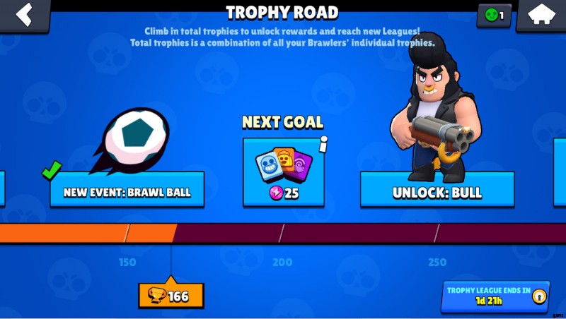 各ブロウラーに注意してください (ゲーム内のキャラクター) には、収集したトロフィーの数に応じて独自のレベルアップがあります。しかし、主なゲージは、獲得したすべてのトロフィーの合計です.