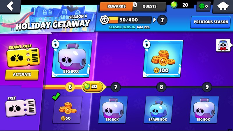トロフィー レベルによって、約 10 人のブロウラーをアンロックできます。しかし、ブロスタの戦利品ボックスからしかアクセスできないファイターもいます。 (または「喧嘩 これらには、トークンを集めることでアクセスできます (各戦闘の終わりに獲得できます)、次に「パス乱闘」に移動します メイン画面の左下にあるメニュー。