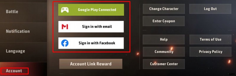 ログインする前に、携帯電話で A3:Still Alive アカウントを Google アカウントにリンクしておく必要があります。 パソコンで これを行うには、設定に移動する必要があります アカウント アカウントを Google にリンク .