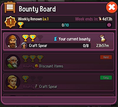 ボーナス タブは、2 番目の親友です。これにより、さまざまな難易度のチャレンジを受け入れることができます たとえば、ジャベリンを 10 個販売したり、今日 5 人の顧客にマークアップを作成したりします。完了したバウンティごとに、一定数の ギルド トークン が与えられます。 (都市に投資することで得られるものと同じもの) を貴重な戦利品に費やすことができます。