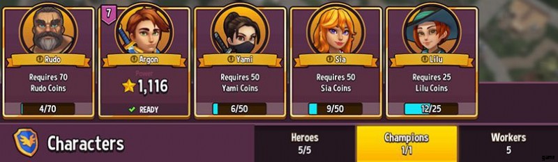 この Shop Titans の初心者向けガイドでは、ヒーローを最適化する方法を既に学習しています。 .ただし、キャラクター メニューの最初のタブだけに注目しないことが重要です。チャンピオン タブでは、チャンピオンのリストを見ることができます 現在入手または使用できます。