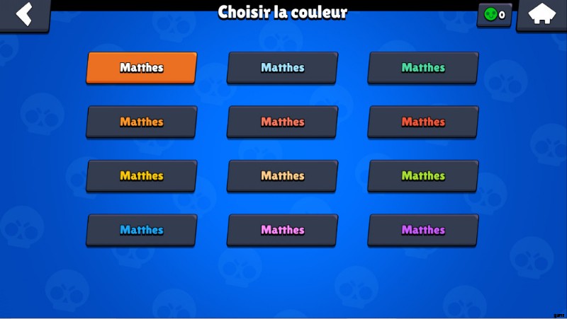 このメニューで、「名前の色」ボタンを押すと 、右上、新しいメニューを開きます。その後、名前の色を変更できます Brawl Stars が提供する 12 色から選択してください。