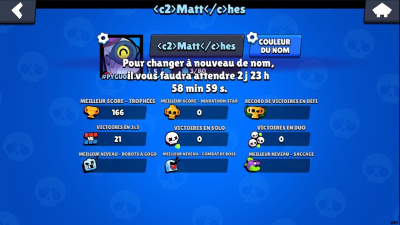 ご注意ください!クラッシュ・ロワイヤルで可能なすべての名前の色の変更がブロスタで実現できるわけではありません. Clash Royale で HTML タグを使用して 2 つの異なる色をニックネームに適用できる場合は、Brawl Stars で試してはいけません。私と同じように後悔するかもしれません。特に、後でニックネームを変更するには、3 日間待って 60 ジェムを支払う必要があるためです! 😆