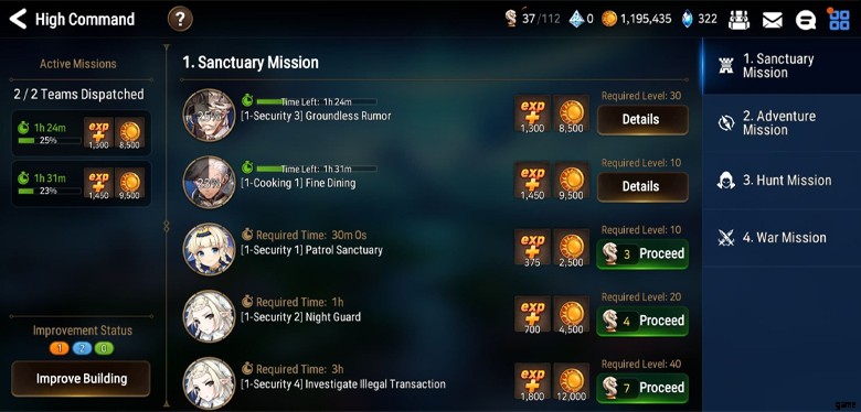 ヒーローをミッションに送り出すことができる建物 リソース(ゴールド、経験値、材料、古代のコインなど)を取得します。建物は最初から役に立ちますが、必ずしも多くの オービスの息 を投資する必要はありません .各アップグレードの 1 ポイントで、すべてのタイプのミッションにアクセスできます。これは、エピック セブン サンクチュアリに十分です。 .