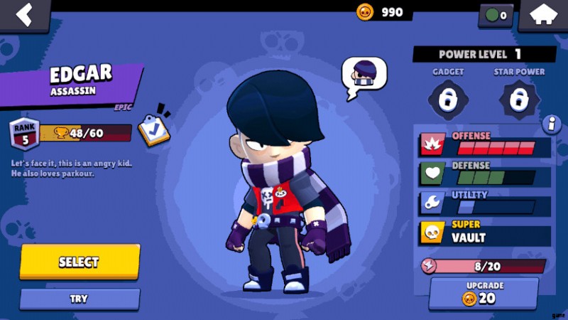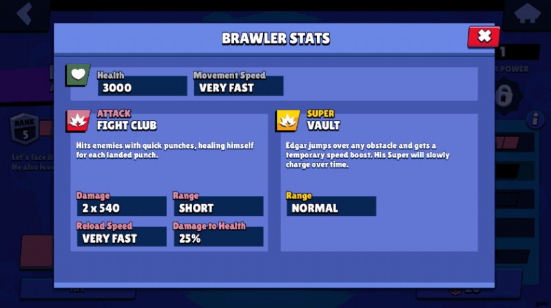 エドガーは暗殺者として登場。 彼の統計と能力は、控えめに言っても、彼が暗殺者であることを裏付けています。彼は最初に使用したときは非常に「無愛想」に見えるかもしれませんが、彼をよく知ることで、エドガーはより巧妙な暗殺者の 1 人になる可能性があります。 Brawl Starsで。