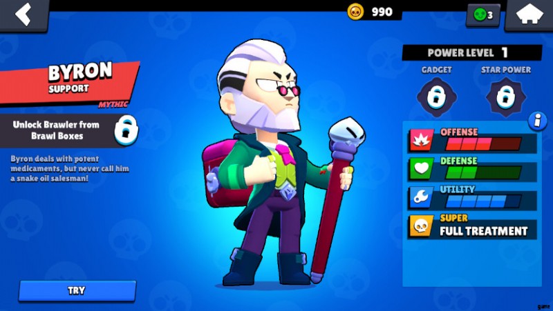 Brawl Stars ビギナーズ ガイドで説明されているように、トロフィーの進行状況によって 7 人のブロウラーをアンロックできます。他のブロウラーについては、ブロウル ボックスを開くたびに、辛抱強く祈る必要があります。 バイロン 神話の 1 つです ファイターなので、ブロウル ボックスを開くたびに 0.25% の確率で彼を獲得できます .したがって、バイロンのロックを解除するのは非常に難しく、ロックを解除すると非常に満足できます。その一方で、彼は独自のゲームプレイで自分の希少性を正当化する方法を知っています。 😉