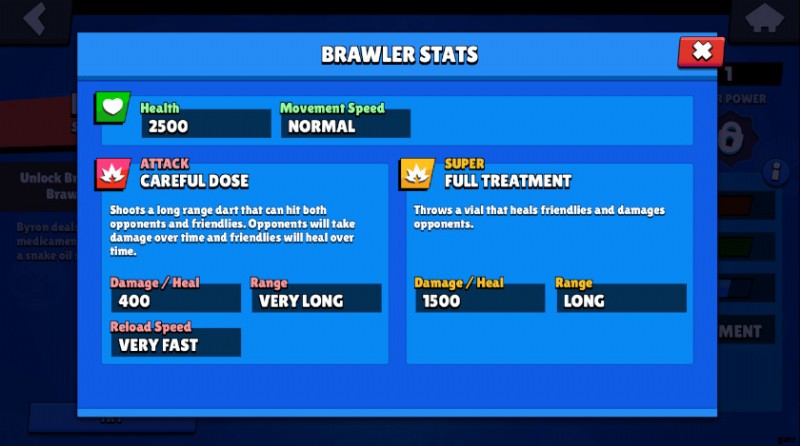 バイロンの平均的な移動速度は、彼の使用をより危険なものにします。 毎秒 2.4 平方で移動 、バイロンは平均的な Brawl Stars ファイターよりも遅いです。