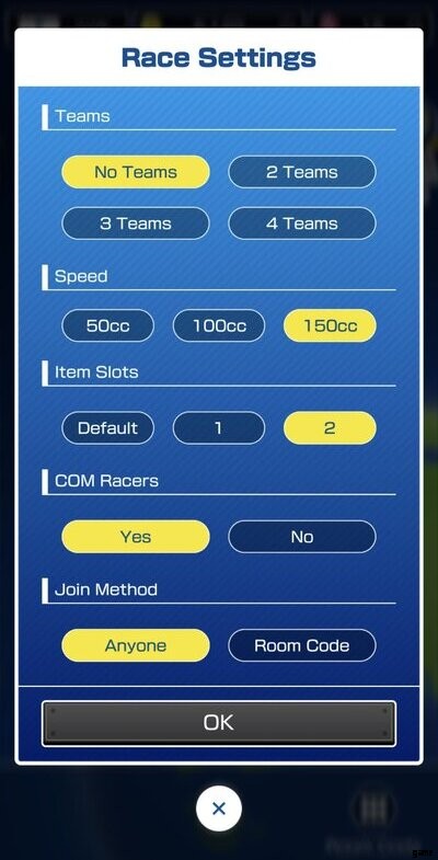次に、[非公開グループを作成] をクリックします。 これにより、レース設定に移動します。チーム数 (0、2、3、または 4)、車両カテゴリ (50、100、または 150 cc)、オブジェクト スロットの数、および参加ルールを決定します。わかりました。