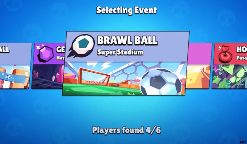 その後、すべてのゲームはランダムなイベントとマップでプレイされます .実際、各ゲームの開始時に、マップとゲーム モードが AI によって完全にランダムに選択されます (Gem Razzia、Brawlball、Heist、Reserved Area、Bounty、Siege など)。