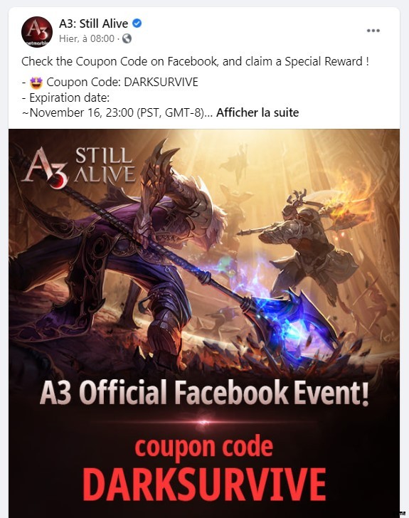 多くのモバイル ゲームと同様に、A3:Still Alive のクーポンまたはコード 公式ソーシャル ネットワークで見つけることができます ゲームのページ。これらは、ゲームで利用可能な最新ニュース (更新、イベント、新機能など) について通知するだけでなく、無料の報酬を提供するのに役立ちます.