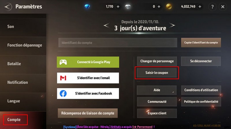 A3:Still Alive on Android でクーポンを有効にする手順: