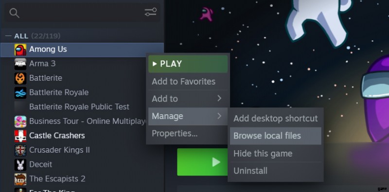 - ステップ 3 :Steam から Among Us ゲーム ファイルにアクセスします。ライブラリに入り、Among Us 設定を開きます (右クリック)。 [管理] を選択します " 次に "ローカル ファイルを参照 ".