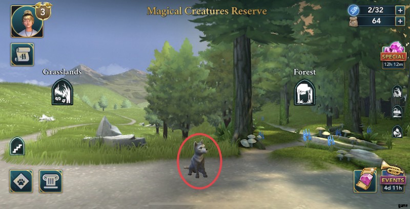 魔法生物の備蓄 :森の前、木の近くにいる小さなオオカミをタップする必要があります。