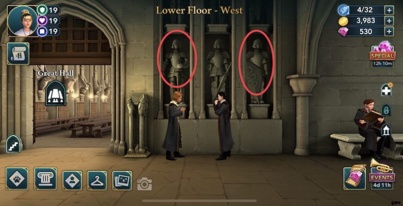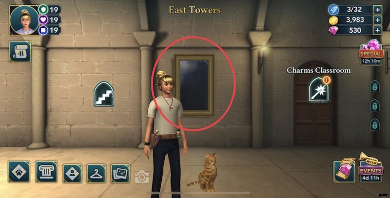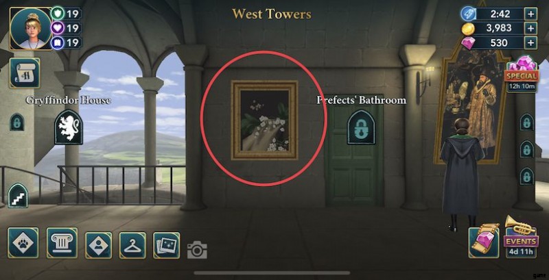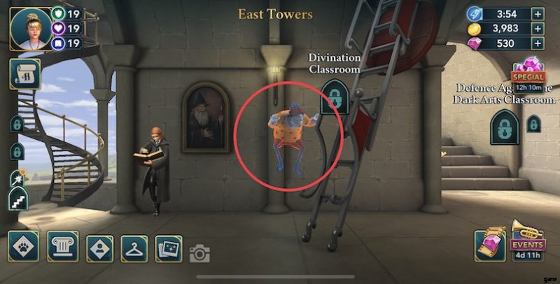イーストタワーズ :ここでエネルギーポイントが2つ貯まります!最初のものは、魔法の部屋の隣の鏡にあります.次に、少女を出現させます。 2 つ目は、幽霊のピーブスで、廊下の端、占い室の隣にあります!
